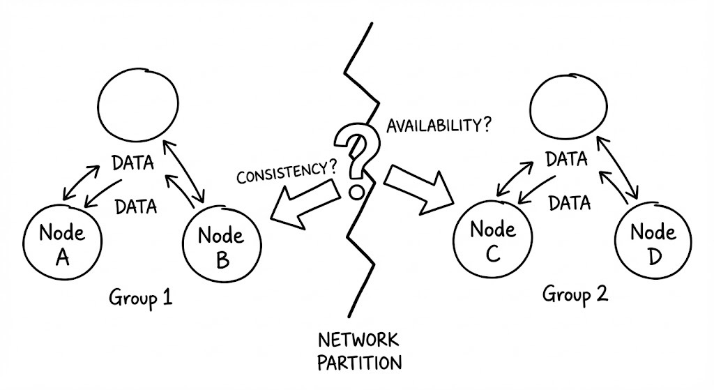 네트워크가 정상일 때는 일관성과 가용성을 모두 누릴 수 있습니다. 그러나 두 노드 사이의 연결이 끊어지는 순간(Partition), 시스템은 외통수에 몰립니다.
