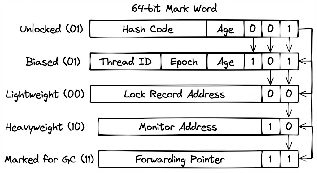 - Lock Information: 현재 이 객체를 어떤 스레드가 점유하고 있는지, 어떤 수준의 락(Biased, Lightweight, Heavyweight)이 걸려 있는지를 나타내는 비트 패턴.