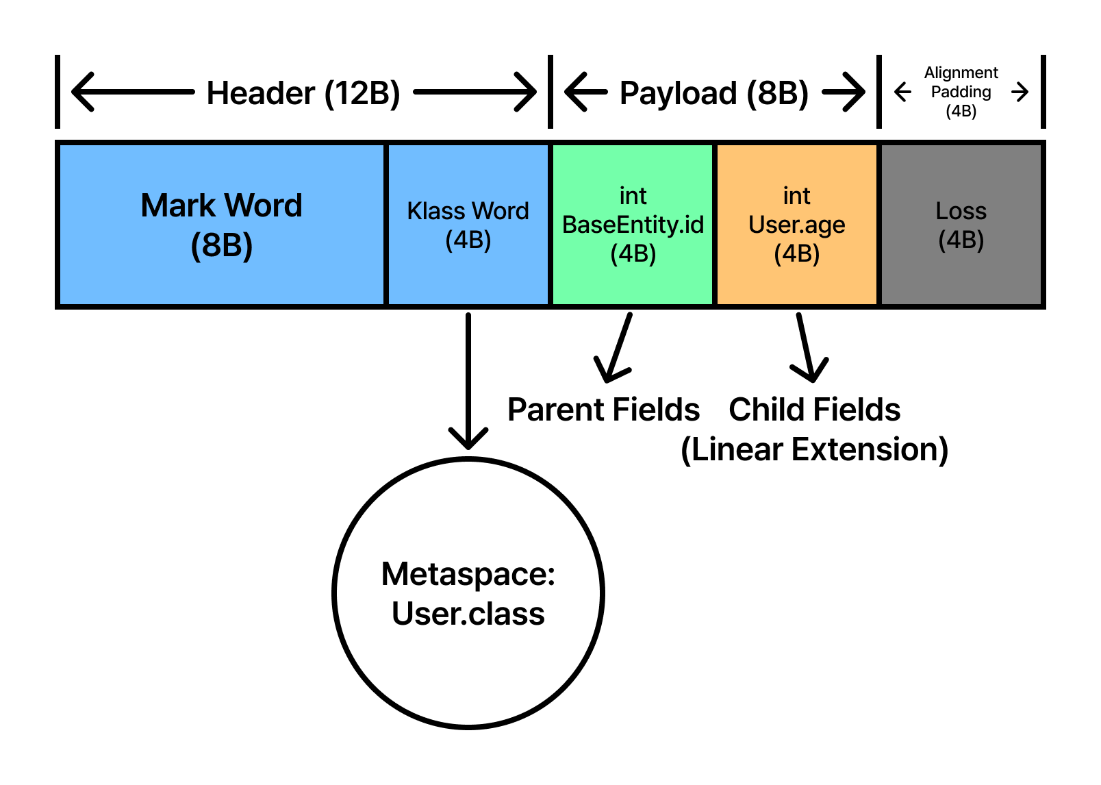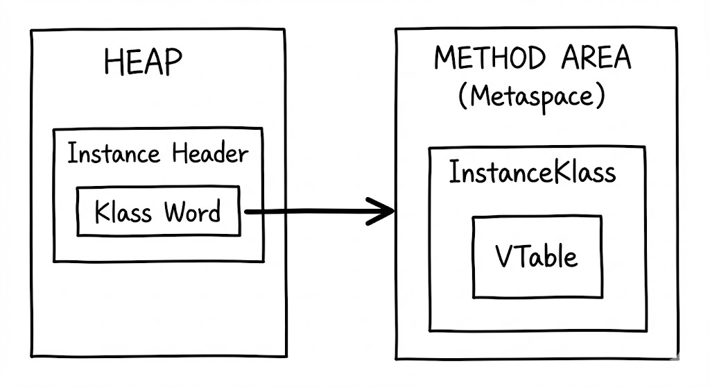 Mark Word가 ‘이 객체가 현재 어떤 상태인가’를 말해준다면, Klass Word는 ‘이 객체는 무엇인가’를 말해줍니다. 이는 해당 인스턴스의 설계도인 Klass 구조체(Metaspace에 위치)를 가리키는 C++ 포인터입니다.