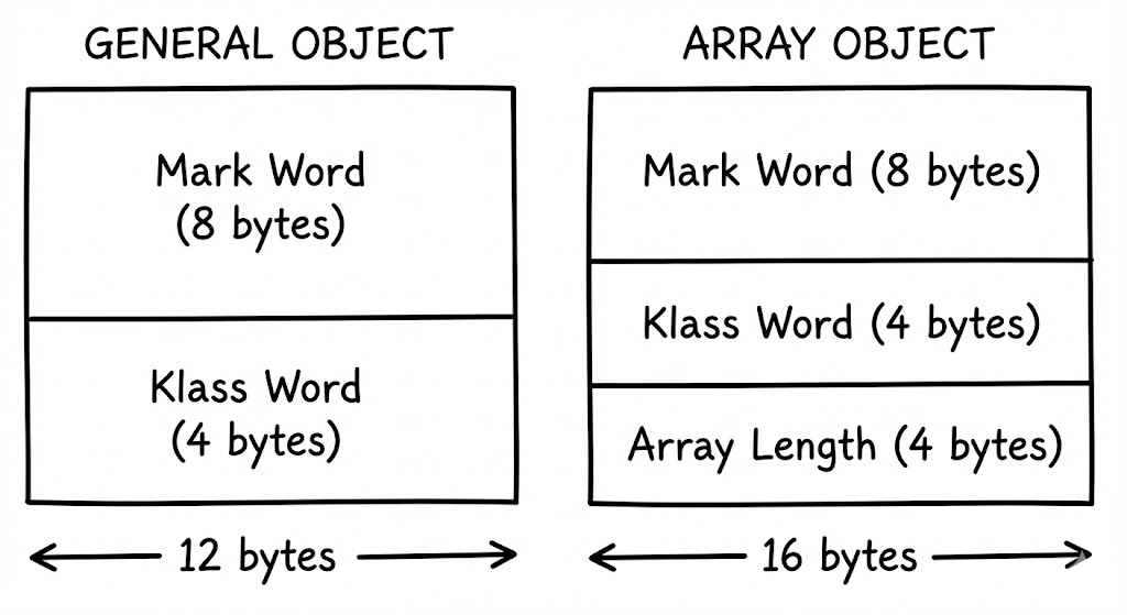 자바의 배열(Array)도 객체이지만, 일반 객체와 결정적인 차이가 있습니다. 바로 ‘길이’ 정보입니다. 일반 객체는 클래스 설계도에 필드 구성이 고정되어 있지만, 배열은 생성 시점에 길이가 결정되므로 이를 별도로 저장해야 합니다. 따라서 배열 인스턴스의 헤더에는 Mark Word와 Klass Word 뒤에 4바이트의 Array Length 필드가 추가로 붙습니다. 결과적으로 배열의 헤더는 일반 객체보다 4바이트 더 큰 구조를 갖게 됩니다.