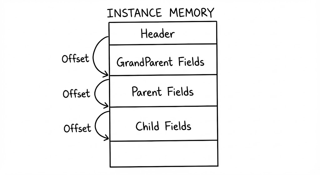 이 메커니즘은 추상 클래스가 단순히 ‘개념적 존재’를 넘어, 메모리상에서 자식 클래스가 따라야 할 ‘물리적 레이아웃의 규격(Layout Specification)’을 강제하고 있음을 보여줍니다. 부모가 정해놓은 VTable의 순서와 필드 오프셋은 자식에게 그대로 전수되며, 자식은 오직 그 안의 ‘내용물(주소)’을 채울 권리만 가집니다.
