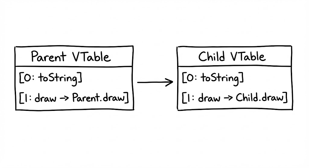 null이 아닙니다. JVM은 이 자리에AbstractMethodError Stub이라 불리는 특수한 공통 루틴의 주소를 채워 넣습니다. 만약 잘못된 로직으로 인해 이 미완성 슬롯이 직접 호출되더라도, 시스템은 붕괴되지 않고 즉시 예외를 던져 스스로를 보호합니다. - 자식 클래스의 슬롯 업데이트 (Overwriting): 자식 클래스인