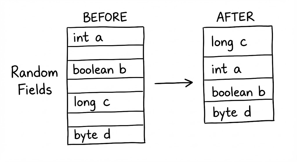 개발자가 클래스에 필드를 byte, long, int 순으로 선언했다고 가정해 봅시다. 만약 이 순서 그대로 메모리에 배치한다면, byte 뒤에 8바이트인 long을 맞추기 위해 무의미한 빈 공간(Padding)이 대량으로 발생하게 됩니다.