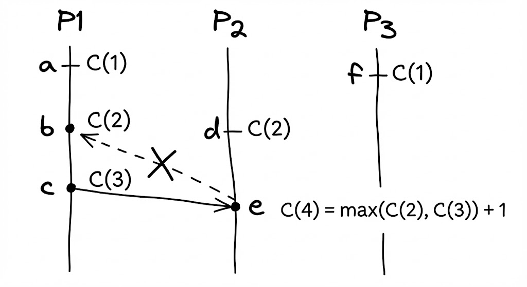 램포트 시계는 각 프로세스가 내부에 정수 카운터를 유지하는 단순한 메커니즘으로 작동합니다. 복잡한 동기화 장치 없이도 네트워크 메시지만으로 전체 시스템의 인과 관계를 추적할 수 있다는 점이 이 알고리즘의 우아함입니다.