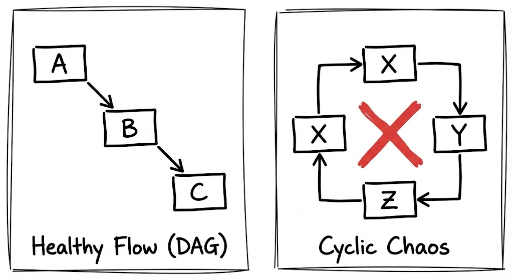์ํ ์ฐธ์กฐ(Cyclic Dependency)๋ ๋ชจ๋ํ์ ๊ฐ์ฅ ํฐ ์ ์ ๋๋ค. ๋ชจ๋ A๊ฐ B์ ์์กดํ๊ณ , B๊ฐ ๋ค์ A์ ์์กดํ๋ ๊ตฌ์กฐ๊ฐ ํ์ฑ๋๋ ์๊ฐ, ๋ ๋ชจ๋์ ๋ ผ๋ฆฌ์ ์ผ๋ก ํ๋๊ฐ ๋์ด๋ฒ๋ฆฝ๋๋ค. ์ด๋ฅผ โ์ํ ์ฐธ์กฐ์ ์ ์ฃผโ๋ผ๊ณ ๋ถ๋ฆ ๋๋ค. ์ด ์ํ์์๋ ํน์ ๋ชจ๋๋ง ๋ผ์ด๋ด์ด ํ ์คํธํ๊ฑฐ๋ ์ฌ์ฌ์ฉํ๋ ๊ฒ์ด ๋ถ๊ฐ๋ฅํด์ง๋ฉฐ, ์ฝ๋ ๋ณ๊ฒฝ์ ์ํฅ ๋ฒ์๊ฐ ์์ ํ๊ณ ๋ฌดํํ ํ์ฅ๋ฉ๋๋ค.