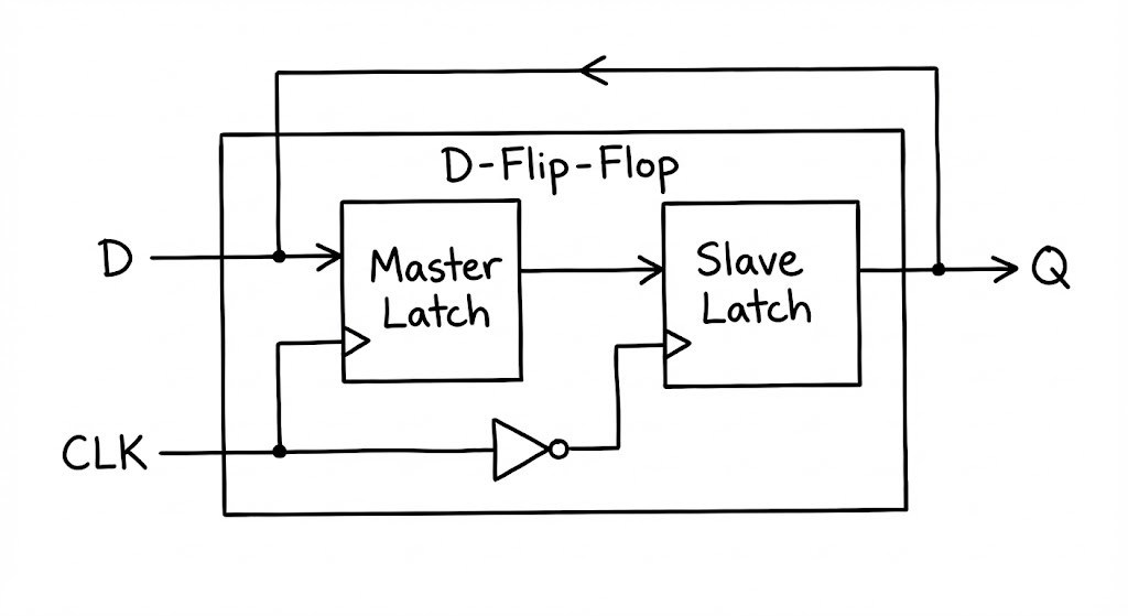 ๋์งํธ ํ๋ก์์ ๋จ 1๋นํธ์ ์ ๋ณด๋ฅผ โ๊ธฐ์ตโํ๊ธฐ ์ํด ์ฌ์ฉํ๋ ์ต์ ๋จ์๋ ํ๋ฆฝํ๋กญ(Flip-Flop)์ ๋๋ค. ๊ทธ์ค์์๋ ๋ ์ง์คํฐ์ ๊ทผ๊ฐ์ด ๋๋ D-ํ๋ฆฝํ๋กญ์ ๋งค์ฐ ํฅ๋ฏธ๋ก์ด ๊ตฌ์กฐ๋ฅผ ๊ฐ์ง๋๋ค. ๋ ๊ฐ์ ๋ ผ๋ฆฌ ๊ฒ์ดํธ๊ฐ ์๋ก์ ์ถ๋ ฅ์ ์๋๋ฐฉ์ ์ ๋ ฅ์ผ๋ก ๋ฐ์ด๋ฃ๋ โํผ๋๋ฐฑ ๋ฃจํ(Feedback Loop)โ๋ฅผ ํ์ฑํ๊ณ ์๊ธฐ ๋๋ฌธ์ ๋๋ค.