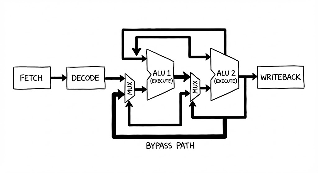 ํ๋ ์ํคํ ์ฒ๋ ์ด๋ฅผ ํด๊ฒฐํ๊ธฐ ์ํด ํฌ์๋ฉ(Forwarding) ๋๋ ๋ฐ์ดํจ์ค(Bypass)๋ผ๊ณ ๋ถ๋ฆฌ๋ ์ง๋ฆ๊ธธ ํ๋ก๋ฅผ ๊ตฌ์ถํฉ๋๋ค. ์ฐ์ฐ ์ฅ์น(ALU)์ ์ถ๋ ฅ๋ถ์์ ๋์จ ๊ฒฐ๊ณผ๊ฐ์ ๋ ์ง์คํฐ ํ์ผ๋ก ๋ณด๋ด๋ ๋์์, ์ฆ์ ๋ค์ ๋ช ๋ น์ด์ ์ ๋ ฅ๋ถ๋ก ์ง์ ์์์ฃผ๋ ๋ฐฉ์์ ๋๋ค. ๋ฐ์ดํฐ๊ฐ ๊ณต์์ ์ธ โ๊ธฐ๋กโ ์ ์ฐจ๋ฅผ ๊ฑฐ์น๊ธฐ ์ ์ ์ค์ง์ ์ธ โ์ฌ์ฉโ ์ฅ์๋ก ๋จผ์ ์ ํํ๋ ๊ฒ์ ๋๋ค. ์ด ์ ๊ตํ ์ฐํ๋ก๋ ๋ ์ง์คํฐ ํ์ผ์ ๋ฐ์ดํฐ๊ฐ ์์ฐฉํ๊ธฐ๊น์ง ๊ฑธ๋ฆฌ๋ ์ ์ฌ์ดํด์ ์ง์ฐ์ 0์ผ๋ก ๋ง๋ญ๋๋ค.