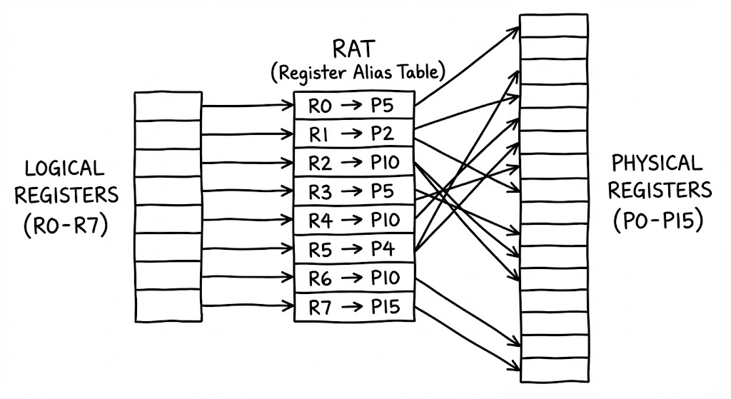 ๋ฆฌ๋ค์ด๋ฐ์ ํต์ฌ ๊ธฐ๊ตฌ๋ ๋ ์ง์คํฐ ๋ณ์นญ ํ ์ด๋ธ(RAT, Register Alias Table)์ ๋๋ค. CPU๊ฐ ๋ช ๋ น์ด๋ฅผ ๋์ฝ๋ฉํ ๋, ๋ช ๋ น์ด์ ๋ช ์๋ ๋ ผ๋ฆฌ ๋ ์ง์คํฐ ๋ฒํธ๋ฅผ ํ์ฌ ๊ฐ์ฉํ ๋ฌผ๋ฆฌ ๋ ์ง์คํฐ ํ(PRP, Physical Register Pool)์ ๋น ๋ฒํธ๋ก ์ฆ์์์ ์นํํฉ๋๋ค.