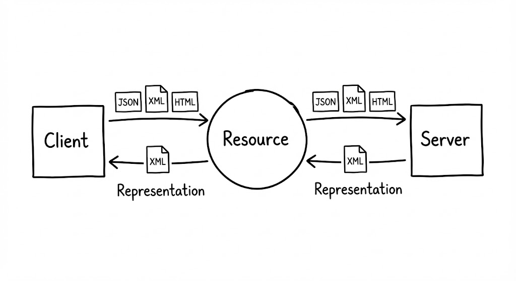 우리가 흔히 접하는 JSON이나 XML은 리소스의 표현 양식 중 하나일 뿐입니다. 동일한 ‘사용자 리소스’라도 클라이언트의 요청(Accept 헤더)에 따라 프로필 이미지가 포함된 HTML이 될 수도 있고, 기계 판독이 가능한 JSON이 될 수도 있습니다.