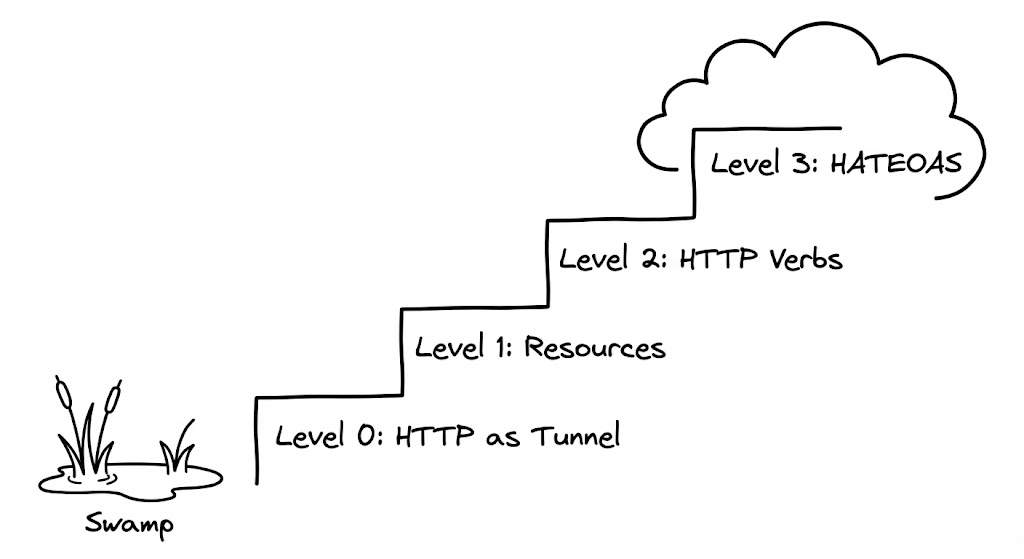 로이 필딩의 이상은 높았지만, 현실의 엔지니어들은 당장 동작하는 코드를 짜야 했습니다. 마틴 파울러가 대중화시킨 ‘리처드슨 성숙도 모델(Richardson Maturity Model)’은 바로 이 지점, 즉 혼돈의 카오스에서 필딩의 유토피아로 향하는 계단을 정의합니다. 이 모델은 단순히 기술적 완성도를 측정하는 잣대가 아니라, 서비스가 복잡해짐에 따라 발생하는 엔드포인트 관리의 어려움을 어떻게 프로토콜의 힘으로 해결할 것인가에 대한 진화론적 관점을 제공합니다.