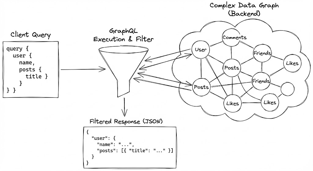 이 과정에서 GraphQL은 REST의 고질적인 병목인 Over-fetching(불필요한 데이터 수신)과 Under-fetching(여러 번의 요청 필요)을 단번에 해결합니다. 클라이언트는 오직 화면 렌더링에 필요한 필드만 정의하며, 서버는 그 정의에 정확히 부합하는 JSON 객체를 조립하여 단 한 번의 라운드 트립(Round-trip)으로 반환합니다.