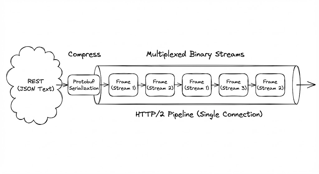 반면 gRPC가 사용하는 Protocol Buffers(Protobuf)는 데이터를 이진(Binary) 형태로 압축합니다. 필드 이름 대신 숫자로 된 태그를 사용하고, 정수는 가변 길이 인코딩(Varint)으로 처리하여 페이로드 크기를 JSON 대비 30~50% 이상 줄입니다. 이는 단순한 네트워크 대역폭 절약을 넘어, 데이터의 직렬화/역직렬화에 소모되는 CPU 사이클을 혁신적으로 단축하여 전체 시스템의 처리량(Throughput)을 끌어올립니다.