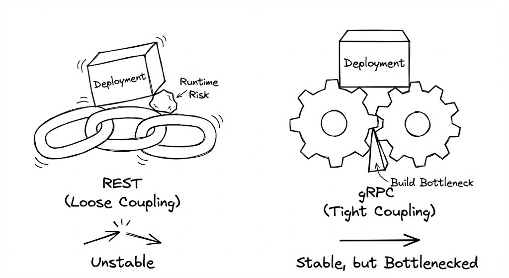 그러나 이 질서에는 ‘배포의 경직성’이라는 대가가 따릅니다. gRPC 명세를 변경하려면 양측 모두가 새로운 코드를 생성(Code Gen)하고 배포해야 합니다. 특히 모바일 앱처럼 배포 주기를 서버 마음대로 조절할 수 없는 환경에서는, 하위 호환성(Backward Compatibility)을 유지하기 위해 프로토콜 버전을 관리하는 운영 오버헤드가 기하급수적으로 증가합니다. 강한 결합이 주는 안정성이 때로는 전체 시스템의 민첩성을 저해하는 ‘배포의 병목’이 되는 역설적인 상황이 발생합니다.