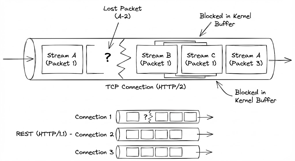 이러한 현상은 패킷 유실률이 높은 열악한 네트워크 환경(모바일 음영 지역, 혼잡한 공용 Wi-Fi 등)에서 gRPC의 꼬리 지연 시간(Tail Latency)을 REST보다 기하급수적으로 악화시킵니다. 여러 개의 TCP 커넥션을 독립적으로 운용하는 REST는 특정 패킷이 유실되어도 해당 커넥션만 영향을 받을 뿐, 다른 커넥션을 통한 통신은 중단 없이 지속되는 ‘장애 격리’ 효과를 누리기 때문입니다.