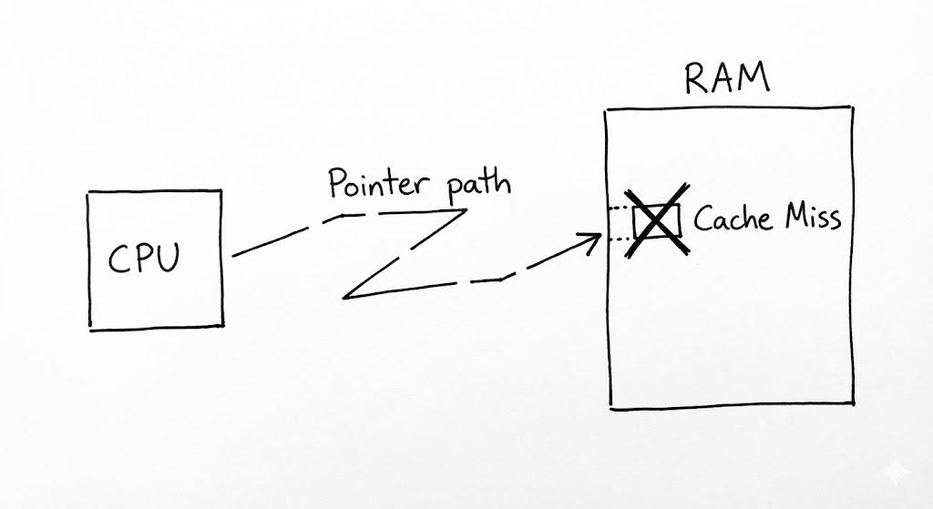 포인터를 따라가는 작업은 현대 컴퓨팅에서 가장 느린 연산 중 하나입니다. 데이터가 작을 때는 문제가 되지 않지만, 수백만 개의 노드를 가진 거대 트리를 다룰 때는 ‘포인터 추적’이 전체 시스템 처리량(Throughput)의 병목이 됩니다.
