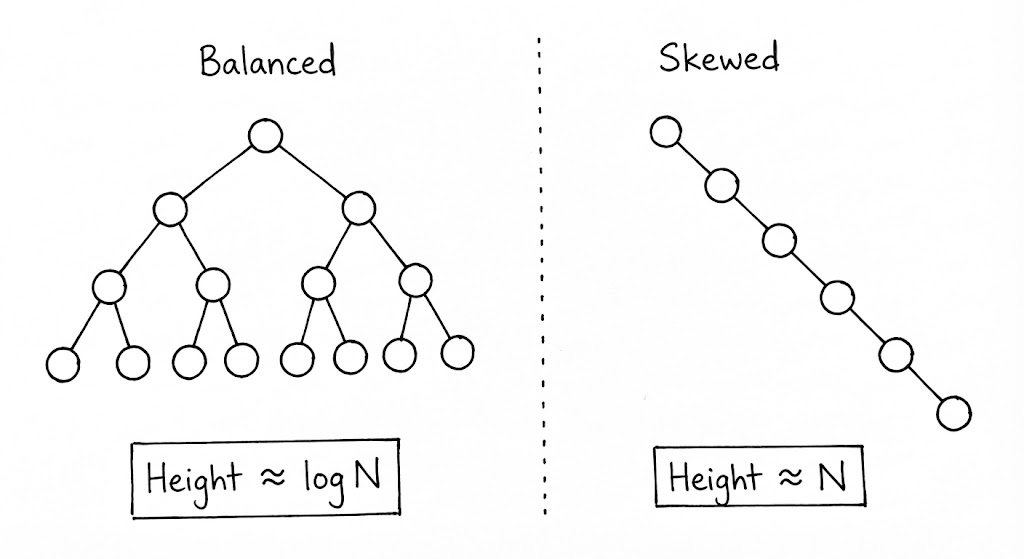 우리가 트리를 설계할 때 주목해야 할 지표는 ‘깊이(Depth)’와 ‘높이(Height)’입니다. 뿌리(Root)에서 특정 노드까지의 거리가 깊이라면, 해당 노드에서 가장 먼 잎(Leaf) 노드까지의 거리가 높이입니다. 이 수치들은 단순한 메트릭이 아니라, 알고리즘의 시간 복잡도를 결정짓는 물리적인 한계선입니다. 특히 현대 시스템에서 트리의 ‘편향성(Skewness)’은 엔지니어링의 적입니다. 균형이 깨진 트리는 사실상 연결 리스트와 다를 바 없으며, 이는 곧 캐시 효율성 저하와 탐색 성능의 타락으로 이어지기 때문입니다.