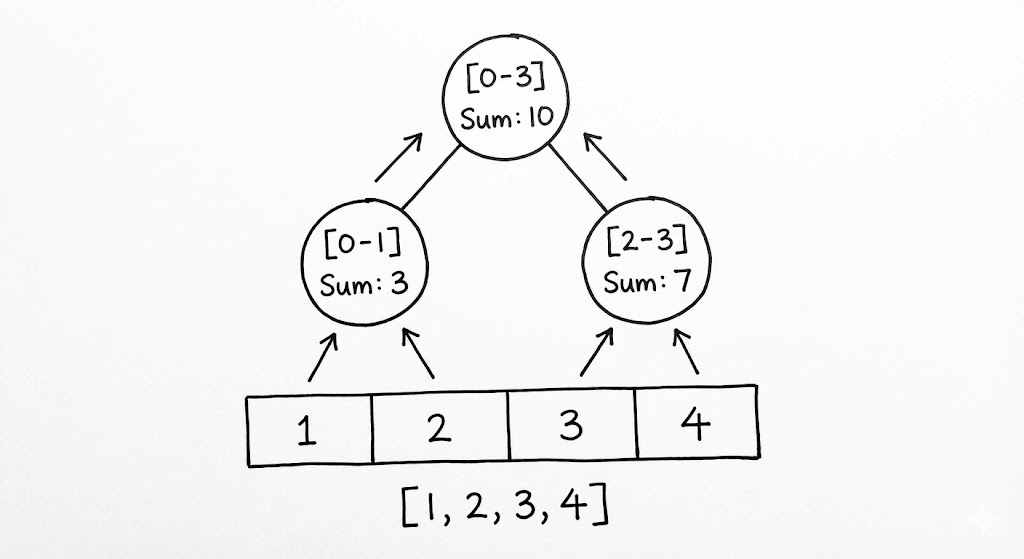 세그먼트 트리의 아름다움은 그 구조적 간결함에 있습니다. 리프 노드에는 배열의 개별 원소들이 자리하고, 부모 노드는 두 자식 노드가 담당하는 구간의 합(또는 최댓값)을 품습니다. 이를 통해 우리는 거대한 배열의 어떤 구간이라도 단 $2 \log N$개 이내의 노드 조합만으로 완벽하게 설명할 수 있습니다. 이는 마치 전국 지도를 시/도, 시/군/구 단위로 계층화하여 특정 지역의 인구 통계를 즉각 산출하는 체계와 같습니다.